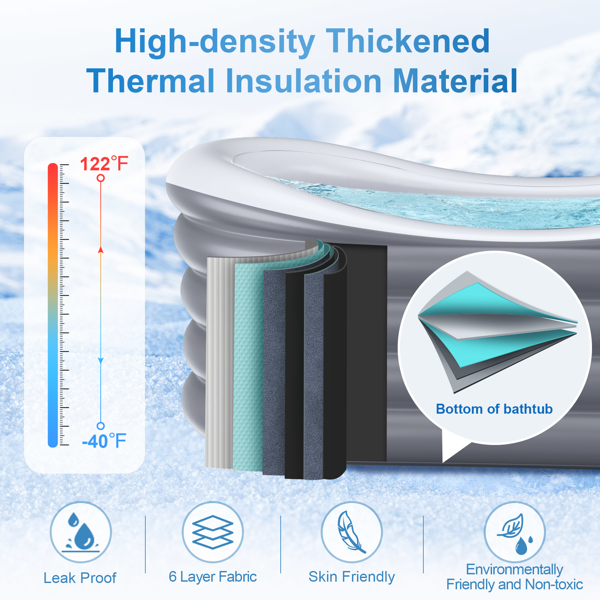 Experience comfort and convenience with the Inflatable Foldable Bathtub for Adults. Made from premium PVC in dark grey, this modern bathtub is durable and reliable. Measuring 66.9in*24.8in*35.4in, it supports up to 330 pounds, perfect for solo or shared use.
